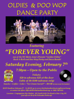 On Saturday, February 7th, Forever Young will be performing at Congregation Shir Shalom, 411 South Little Tor Road, New City, NY.[Congregation Shir Shalom is at the same location as the former Nanuet Hebrew Center.]This is Bruce’s synagogue and this event is OPEN TO THE PUBLIC. Fun starts 7:30pm.Tickets: $20 in advance; $25 at the door. OR, reserve a table of 10 for $180 (advance sale only). Light refreshments will be served – including snacks, coffee and cake – plus a 50’s style “Ice Cream Social!” B.RSVP Deadline: Thursday, February 5th. To RSVP, go to https://www.shirshalomrockland.org/event/oldies-doo-wop-dance-party-featuring-forever-youngor contact the office at (845) 708-9181 or office@shirshalomrockland.org