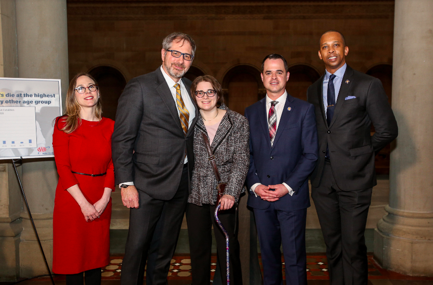 Dr. Kurt Edwards, chief of Trauma and Critical Care at Albany Medical Center said, “I want to thank Senator Carlucci and Assemblyman Mosley. I also want to thank Laura Casellini who was taken care of by one of my colleagues. The perseverance and dedication to come out here and survive the injury that she sustained is pretty incredible, and what makes my job incredible is to see someone like her make it through and come here speak to you. Seat belts for back seat passengers is a simple way to save lives. I have seen enough people injured and seriously injured who did not have a seat belt on in the back seat. Regretfully there are a lot who haven’t made it to my trauma center because they didn’t live because they didn’t have their seat belt on in the back seat. Let’s make it purposeful and a law for people to wear a seat belt in the back seat because it doesn’t cost anything and will save lives.”